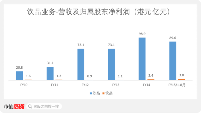 饮品业务表现稍好,2019年营收为98.9亿港元,净利润为2.4亿港元。