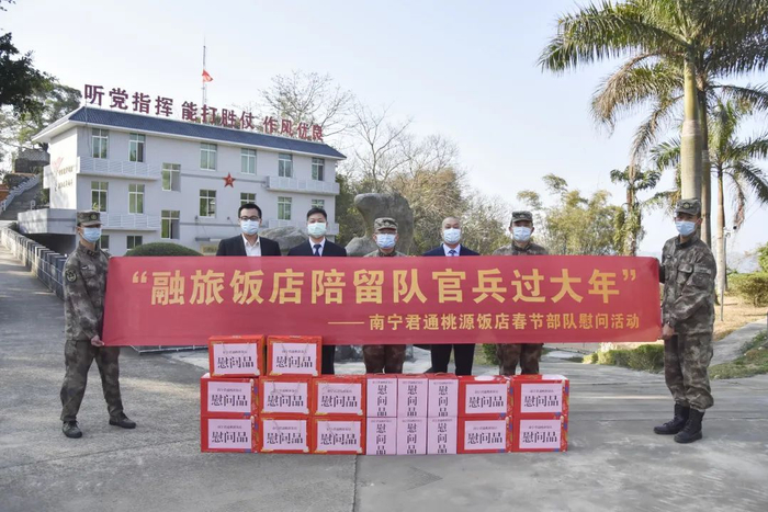 南宁桃源饭店携慰问品拜访中越边境南宁凭祥哨所官兵,为驻守边关的指战员献上节日慰问和美好祝福。该哨所位于南部边境,战士们担负着守疆戍边的职责,慰问中,桃源饭店的同事得知家在南宁市的沈排长原本计划回家过年,但由于执勤需要,只能让父母独自在家过年。桃园饭店一行人当天下午离开哨所即到了沈排长家中,向沈排长母亲表达美好的节日祝福,并送去年夜饭半成品。