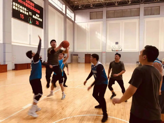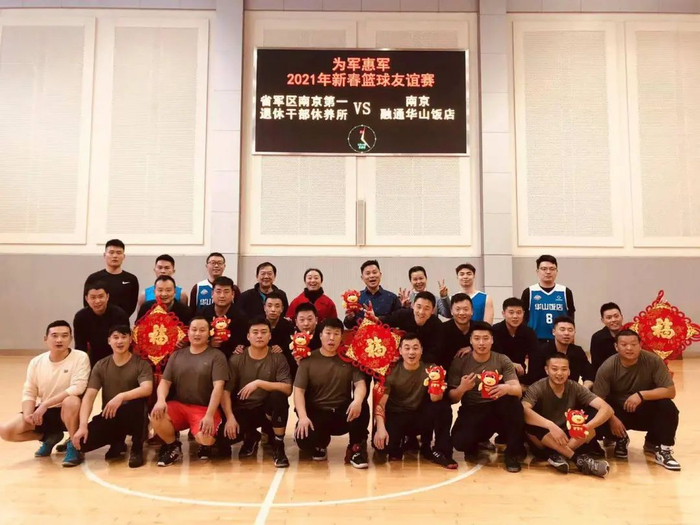 南京华山饭店组织职工与江苏省军区驻南京官兵举办篮球友谊赛。