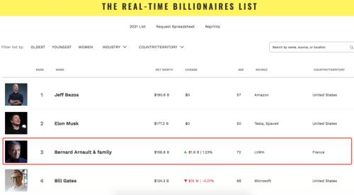 根据福布斯实时富豪榜排名,虽然无法和电商亚马逊的贝索斯和新能源巨头特斯拉创始人马斯克相比,但是LVMH创始人贝尔纳·阿尔诺和他的家族依旧坐稳世界首富前三,以1568亿美元(约1.01万亿元人民币)净资产额,超越比尔盖茨。