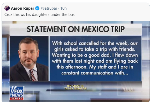 对于自己去坎昆度假被拍到一事,克鲁兹起初一度耍起了无赖,说什么都是因为疫情的影响导致学校关门,所以自己为了“做一个好父亲”,才选择陪自己的女儿和朋友出门玩。