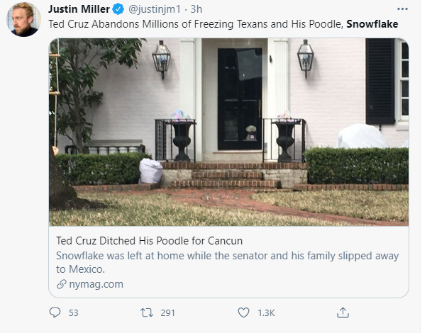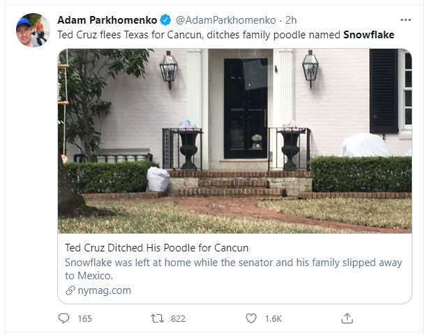 不过,事情到这里还没有结束。因为随着更多美国媒体对此事的介入,克鲁兹一家又被扒出一个涉嫌“虐狗”的细节:当他和妻子女儿因为得州家里太冷而前往坎昆度假时,他们却将家里养的一只名叫“雪花”的小狗狗丢在了得州的家中。