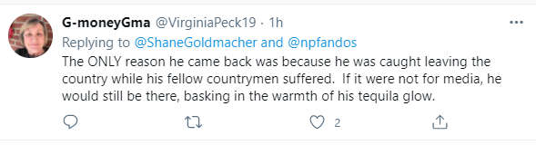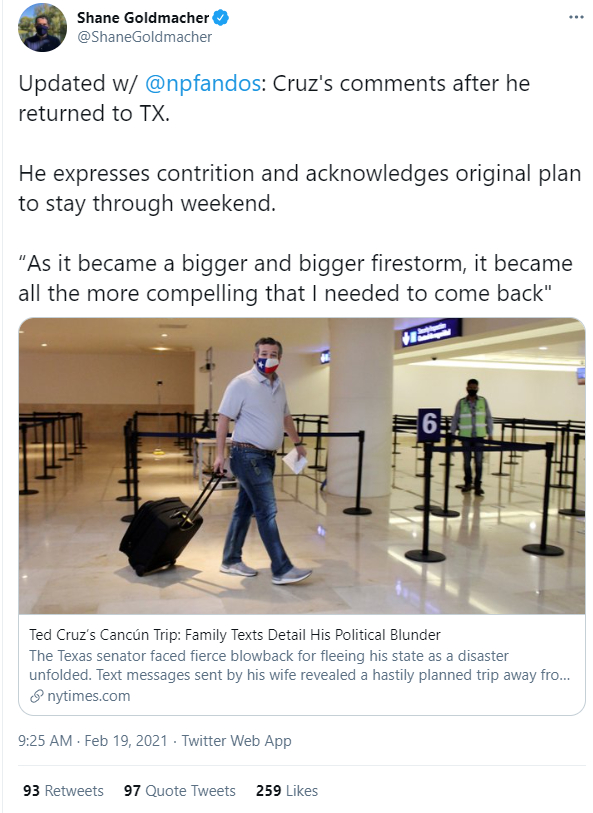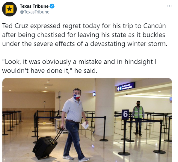 在如此汹涌的舆论谴责下,克鲁兹只得提前一天结束了自己的假期,并在机场被媒体采访时一边假惺惺地表示他对在得州人民受灾时出去度假的行为感到“遗憾”,表示自己的行为是个“错误”,一边又颇为不甘地表示鉴于舆论情绪越来越“激烈”,他也必须回来。