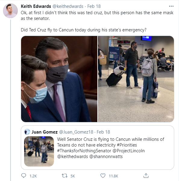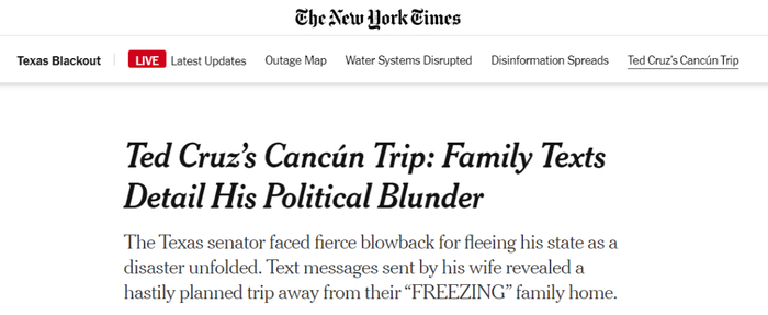 然而,这个四处“拉仇恨”的克鲁兹,近日又干出了一件让美国社会更为震怒的事情:在他的家乡得州因为电力供应故障而到处停电,致数百万人在寒冬下挨冻,更有至少20人因此丧命的情况下,这位拿着纳税人发给他的工资、本该尽心尽力维护得州民众权益的国会参议员和职业政客,却被人发现一身休闲地带着妻子和女儿出现在了机场,准备登机前往墨西哥温暖的旅游城市坎昆……