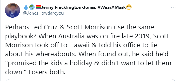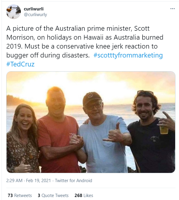 另外,让人有些意外的是,克鲁兹这一遗弃得州受灾民众出国度假的行为,还害得澳大利亚总理莫里森也跟着挨了骂。原来,克鲁兹的行为让不少关注到此事的澳大利亚网民,又重新想起了莫里森在2019年澳大利亚森林大火期间,也曾弃受灾民众疾苦于不顾,跑到夏威夷度假养膘的恶心事。
