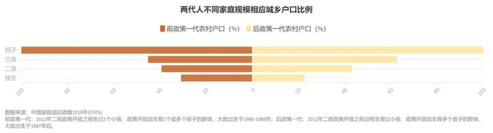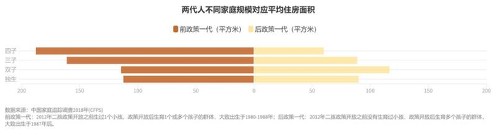 在前政策一代中,生育孩子的数量越多,家庭的平均住房面积就越大。但在后政策一代中,生育2个孩子的家庭平均住房面积最大。原因并不复杂,其实就看农村家庭的占比。在后政策一代中,二孩家庭农村户籍的占比提高了,就提升了该类型家庭的平均住房面积。