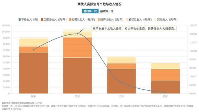 但并不是“越有钱越能生”,在放开二孩政策后生育的家庭(后政策一代)中,收入越高的家庭,生育孩子的个数反而越少,独生子女家庭的总收入最高。但是放开政策前生育的家庭(前政策一代)中,生育2个孩子的家庭总收入最高。