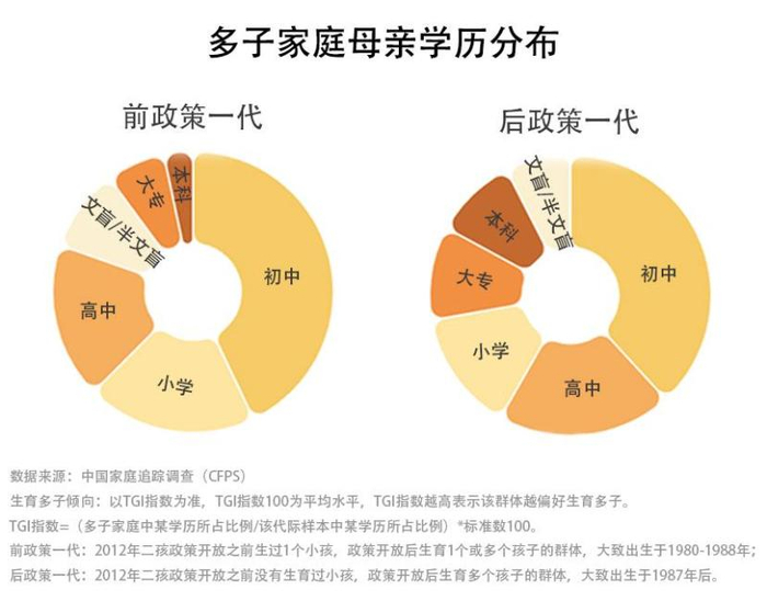 在前政策一代的多子家庭中,学历平均线以下(初中及以下)的女性学历越高,生育多子的倾向反而越高;学历平均线以上(初中以上)的女性学历越高,生育多子的倾向越低。数据显示,在前政策一代中,高中及以下学历的TGI指数(代表生育多子的倾向)在96-110之间,其中初中学历的生育倾向最高。而初中学历是前政策一代总样本中占比最高(39%)的群体,是人口生育的主力军。