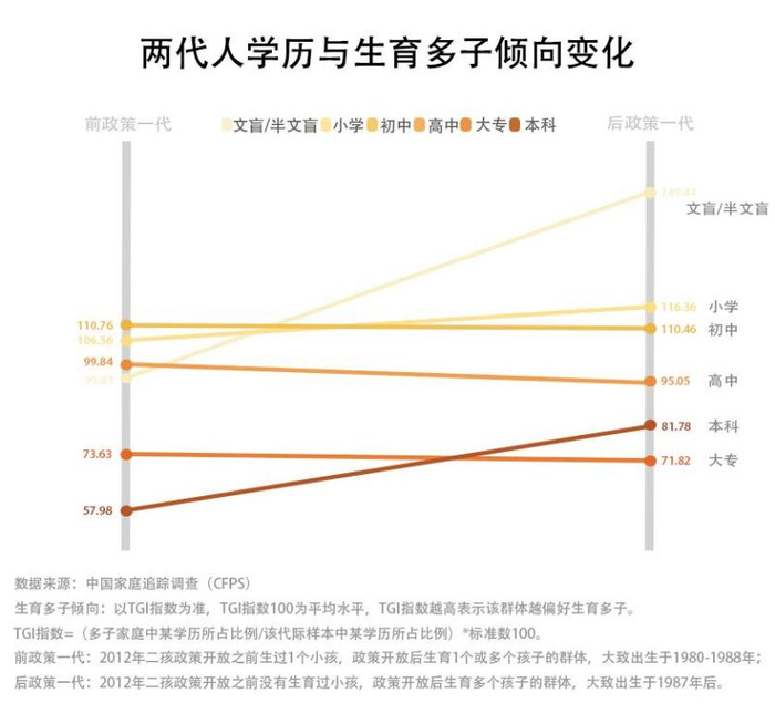 值得注意的是,后政策一代整体受教育程度上升(体现为初中以下学历占比降低约10个百分点,同时高学历人口占比提升),且本科学历生育多子倾向相比政策前一代明显升高,不过,文盲及半文盲的生育多子偏好度飙升幅度最大。