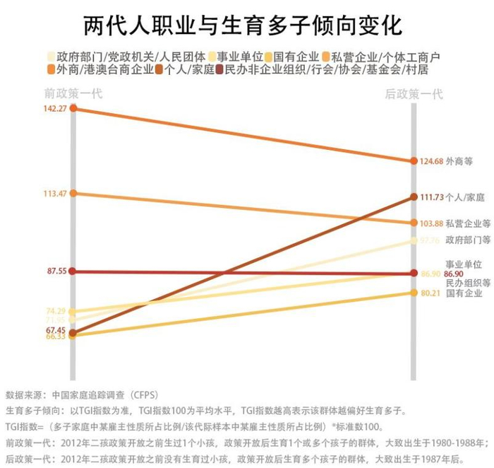 到了后政策一代,政府企事业单位雇员的TGI指数(代表生育多子的倾向)虽仍低于100,但逐渐提升;相应地,私有及外资(含港澳台)企业雇员的TGI指数(代表生育多子的倾向)虽然仍为最高,但出现了较大幅度的下滑,说明相比于前政策一代,后政策一代的体制内女性生育多子倾向上升,而私企及外企女性职工生育多子倾向则出现下滑。
