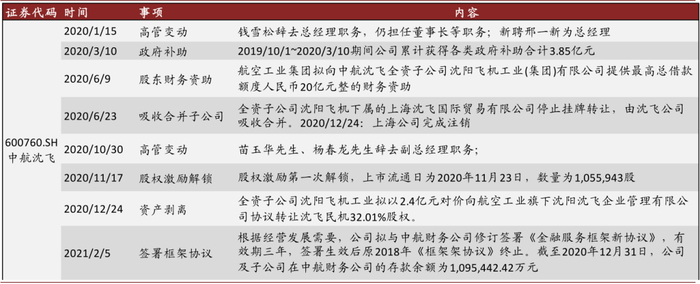 图表: 中航沈飞2020年初至今(2021/2/16)主要事件梳理