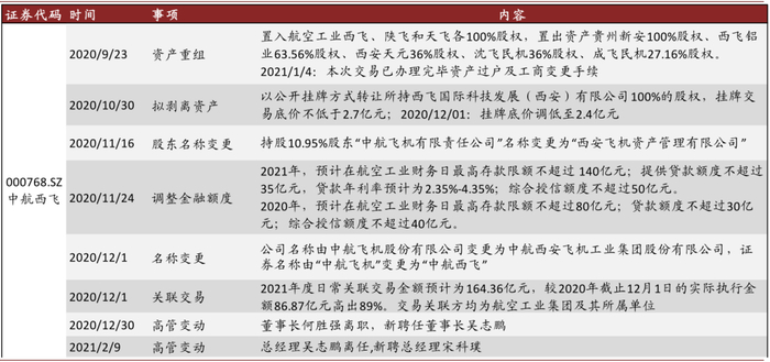图表: 中航西飞2020年初至今(2021/2/16)主要事件梳理