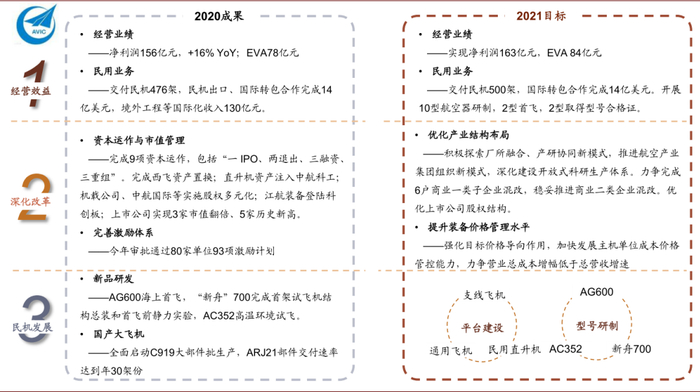 ► 深化改革:1)截止2020年底,融合发展实现“三个70%”的改革目标,主机厂平均一般能力社会化配套率75%,产业融合收入占总收入比例74%,资产证券化率71%;2)“瘦身健体”取得成效,“十三五”期间总部部门由19个减少到14个,累计压减法人单位超1000户,法人层级由11级压缩至6级,推动首批9家科研院所转制;3)优化航空产业组织,2020年完成:西飞、陕飞、天飞资产整体上市,直升机资产注入中航科工,江航装备登陆科创板,中航无人机、航为高科、中航空管混改方案获批复,机载、中航国际等实施股权多元化等工作;4)持续推进激励制度建设。