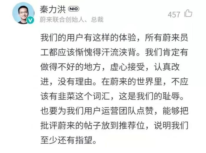 2019年3月,在王祺成为蔚来车主半年后,他发表帖子称蔚来ES8达到了自己85%的期望,但仍有值得吐槽的地方:人机交互系统待、电池管理技术都有待改进。随后,秦力洪出现在了评论区,并回复:“很真实。”王祺的帖子也被推荐至首页,引来234条评论。