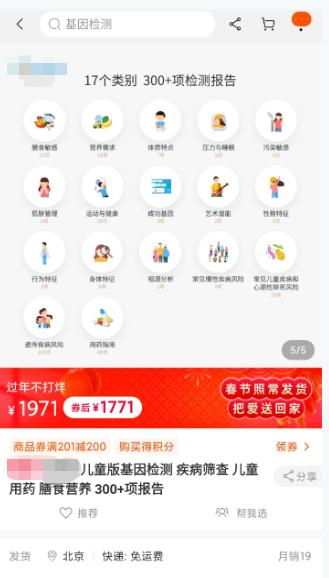 另一个标有“圆基因儿童版基因检测疾病筛查、儿童用药、膳食营养、300+项报告”的商家,产品标价1971元,月销19个。