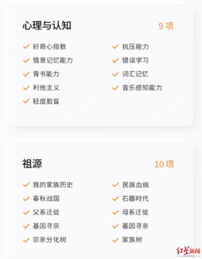 红星新闻记者在电商平台上询问了为朱先生做基因检测公司的客服,该客服表示,测试的标准版包括超过160个项目,共需要花费499元,其中包含遗传风险、用药安全、皮肤管理、饮食习惯、心理与认知、祖源等。其中“祖源”包括家族历史、父系迁徙、母系迁徙、家族树等。“心理与认知”包括背书能力、词汇记忆、音乐感知能力、利他主义等。“这些项目的准确率都是99%。”客服还强调称。
