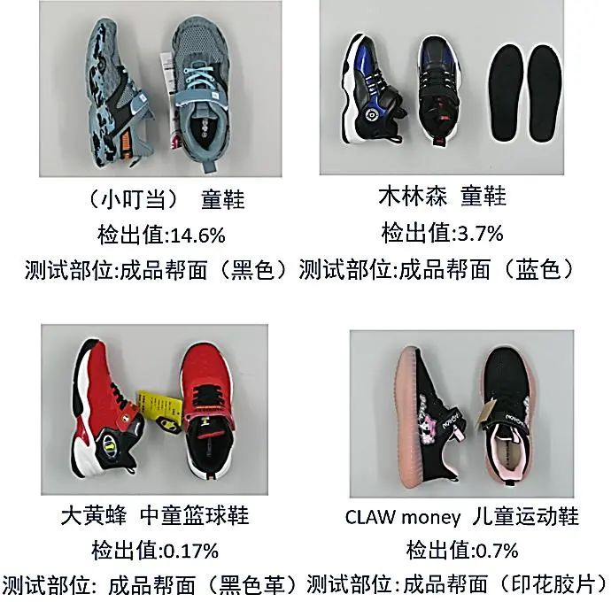 测试结果显示,36款童鞋样品中32款样品通过化学安全性测试,木林森、大黄蜂、CLAW money等4款样品未通过邻苯二甲酸酯测试,《鞋类 鞋和鞋部件中可能存在的危害物质 鞋材料中邻苯二甲酸酯的测定》规定的标准值及允差值为≤0.1%。