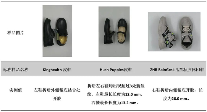 测试结果显示,耐折性能/屈挠性能方面,Kinghealth、Hush Puppies、 ZHR Baingesk3款童鞋样品未能通过该项目测试,此项是鞋类产品穿着寿命的综合质量指标,其直接反映了产品帮面、外底的耐屈挠性以及帮底结合牢度,如果产品的耐折性能/屈挠性能不满足标准要求,在穿着过程中可能会导致鞋底断裂、帮面裂浆、裂面或帮底、底墙开胶等问题。