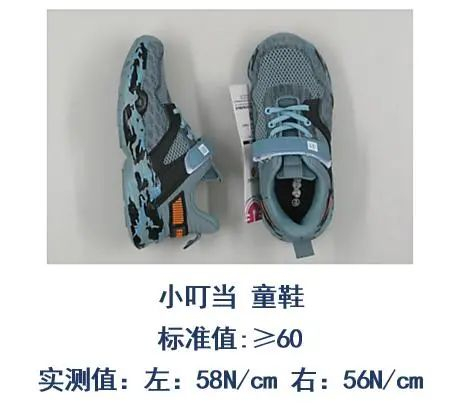 剥离强度方面,小叮当童鞋样品未能通过该项目测试,此项目是考核鞋帮和鞋底粘合质量,剥离强度差的产品在穿着过程中帮底粘合部位易发生脱胶,影响使用寿命。