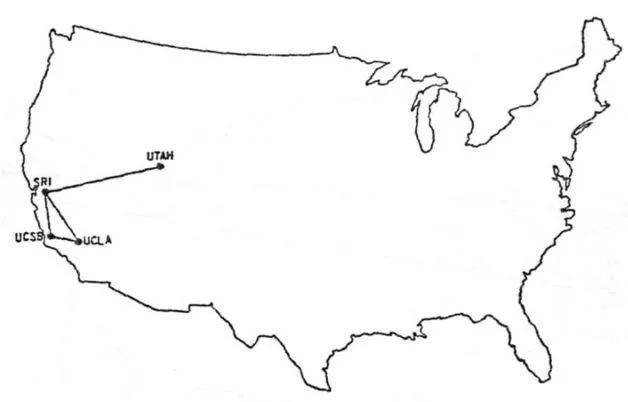 项目的第一阶段,拉里·罗伯茨计划在美国西南部建立一个四节点的网络。节点分别是加州大学洛杉矶分校、斯坦福大学研究学院、加州大学圣巴巴拉分校和犹他州大学的四台大型计算机。
