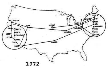 从1970年开始,加入ARPANET的节点数不断增加。到1972年时, 节点数达到 40个。E-mail、FTP和Telnet,是ARPANET上最主要的应用。尤其是e-mail,占据了75%的流量。