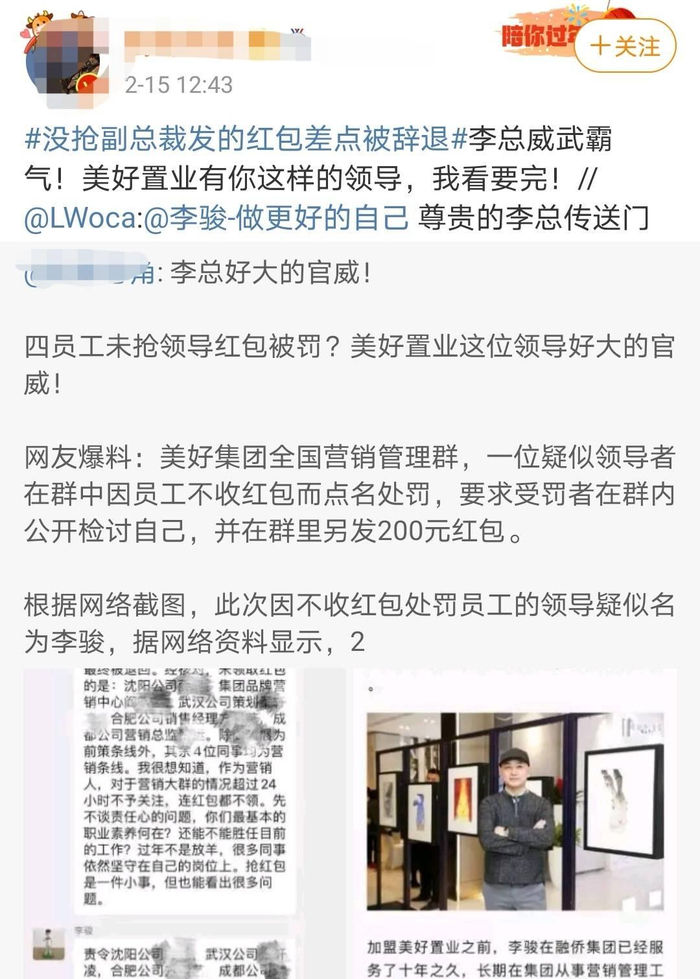 近日,有网友在微博爆料称,今年春节前,北京房企美好置业集团副总裁李骏因几名员工未在微信群内“争抢”其发出的红包,特地要求涉事员工进行检讨道歉,外加200元红包处罚。事件引发网友热议,不抢红包反倒有错了?
