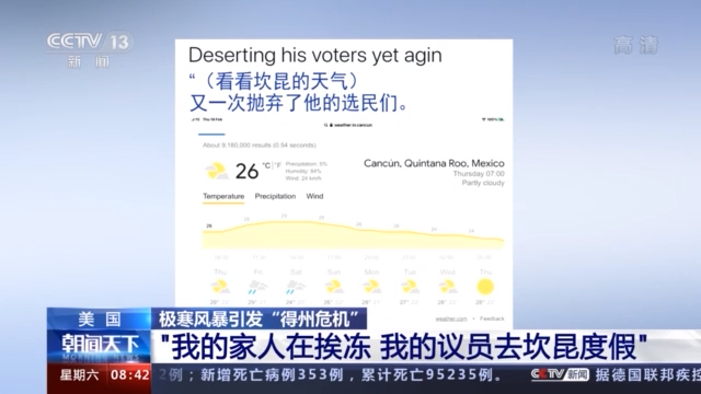 得克萨斯州的居民在寒潮中挨冻,而得克萨斯州一些官员的表现让人倍感气愤。家住得克萨斯州的共和党国会参议员特德·克鲁兹带家人出国度假躲避严寒,引发舆论哗然。