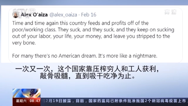 “一次又一次,这个国家靠压榨穷人和工人获利,敲骨吸髓,直到吸干吃净为止。对很多美国人来说,根本没有所谓的美国梦,那更像是一场噩梦。”
