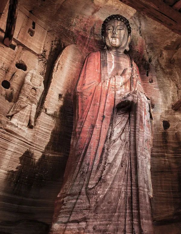 在古代佛教造像中最多的主角便是佛祖释迦,虽各朝各地风格略有差异,但基本就是坐立卧三种正面朝向观者的姿态。在安岳圆觉洞中,却有一尊侧立偏头的释迦佛,大佛连座高5.26米,头饰螺发,高肉髻正中嵌髻珠,眉间有白毫,右手拇指与食指间夹一金波罗花结说法印, 左手作与愿印,身披袈裟,头向右侧,双目下视恰与右壁下方双手合十、企首仰望、嘴角带笑的高2米的弟子迦叶遥相呼应,师生间相视相接,那种心有灵犀的默契异常生动。