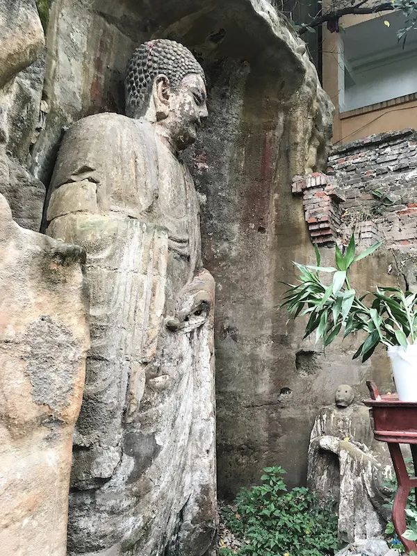 资中那龛4米高令人过目不忘的微笑大佛90年代被群众两次野蛮妆彩后原貌尽失,其动人的形象永远定格于泛黄的照片中,大足中敖那龛头部早毁且淹没于水库中,内江东林寺的大佛被拆迁垃圾包围,风吹雨打法相颓败,仁寿刻于1184后的那龛虽比例失调已显出晚期石刻的颓势,却因题材罕见保存较好幸运的进入国保。