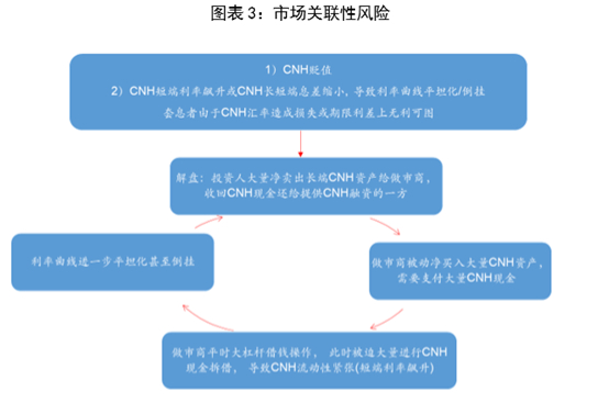 关联性风险一个典型的例子是2015年汇改之后香港离岸人民币CNH利率市场流动性风暴。香港离岸人民币市场由于CNH汇率下降,大量做市商外汇奇异期权TARF净持仓由价外转向价上,市场风险指标如Delta和Vega急剧上升超标引发做市商风险对冲操作,导致2015年8月24日市场出现大量USD/CNH波动率买盘(即买入USD/CNH期权)和USD/CNH即期买盘(卖出CNH),外汇市场上CNH进一步显著下行。当时的市场结构是2013年以来,人民银行保护性地长期抑制CNH波动性,维持高期限息差,在香港形成了大规模的套息套汇为主的高杠杆投机市场,投资人融资美元兑换成CNH,而后以短搏长去投资CNH长债,实现CNH期限套利(Carry)。这种Carry交易的获利空间受到CNH贬值或利率曲线平坦化的负面影响。事实上,2015年8月24日CNH的急剧贬值引发了Carry投资人解盘抛售长端CNH资产,做市商被动净买入并需要相应地支付CNH现金,这导致以高杠杆融资为特征的做市场被迫紧急进行大量CHN现金拆借,引发CHN利率市场短端利率飙升,利率曲线平坦化,进一步引发链式反应式的解盘风暴和短端利率持续飙升甚至利率曲线倒挂 (见下图)。
