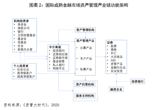随着近年来资管新规的落地,“非标+房地产+隐性保本理财”的模式不再适用,而伴随着规模的增长,客户的多层次化,投资者差异化的收益需求和风险波动的承受能力对资产管理提出了更加精细化的要求,资产管理者需要针对不同投资的个性化需求,进行分层化的个性化管理,提供与投资人收益与风险要求匹配的解决方案,对接合适的产品。市场对各种金融机构的角色定位和金融产品需求将变得越来越多样化,金融市场的深度和广度将相应地扩大。下图给出了国际成熟金融市场中可资借鉴的资产管理产业链的功能架构,其中作为中介机构的券商通过做市商业务对于证券工具(各种风险的定价和对冲)产品的创设和流动性支持上起到了非常重要的作用。