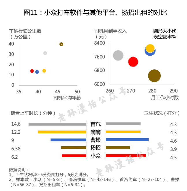 通过实地调研我们发现,与龙头老大滴滴相比,小众打车软件拥有司机更年轻、工作小时数更低、综合上车时长更短的优势。且与其他主流打车软件相比,车辆较新、空驶率低、卫生状况相对更好。