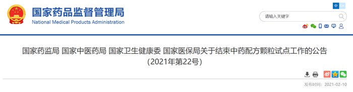 2月10日,国家药监局、国家中医药局、国家卫健委和国家医保局联合发布了《关于结束中药配方颗粒试点工作的公告》,宣布从1993年延续至今的中药配方颗粒试点工作,将在今年11月1日,面临终止。