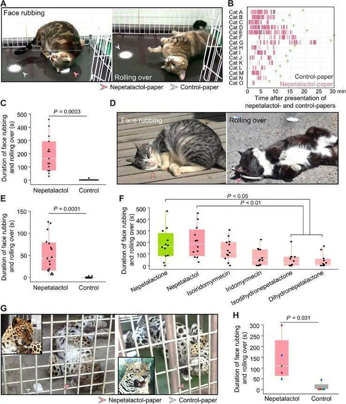 结果表明所有猫都对浸有荆芥内酯的过滤纸均表现出了典型的亢奋行为,如将脸部头部在叶子上摩擦、躺在地上来回翻滚等等。