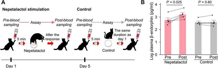 为了进一步揭开荆芥内酯是如何让猫产生亢奋状态的,研究人员分别采集了猫接触荆芥内酯前后5分钟的血液样本,并检测了其血液中β-内啡肽的含量。
