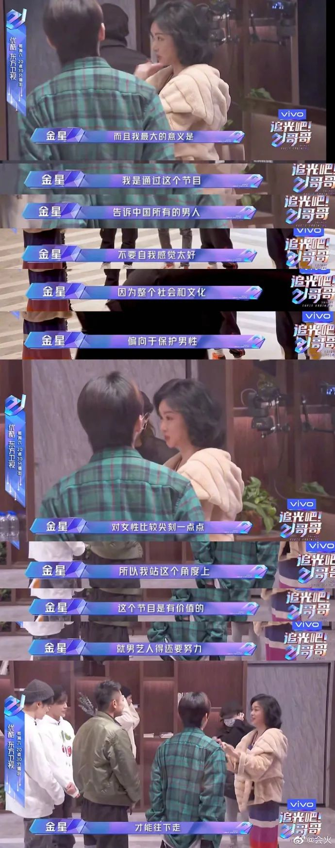 “男人的迷之自信到底从哪来的?是社会给的。首先整个社会对女人一直更严苛。演艺圈更甚,颜值,各个方面都很苛刻,而且我们中国现在演艺圈里面,主导是粉丝文化,粉丝里面百分之七八十是女性。而女人对女人要求更严苛。哥哥帅就完事了,但对同性的姐妹却那么严厉。女人何必为难女人,但恰恰我们的粉丝文化,女性对女人要求更加严苛。”从娱乐圈扩散到大环境对男女要求的不同,金星感触颇深。