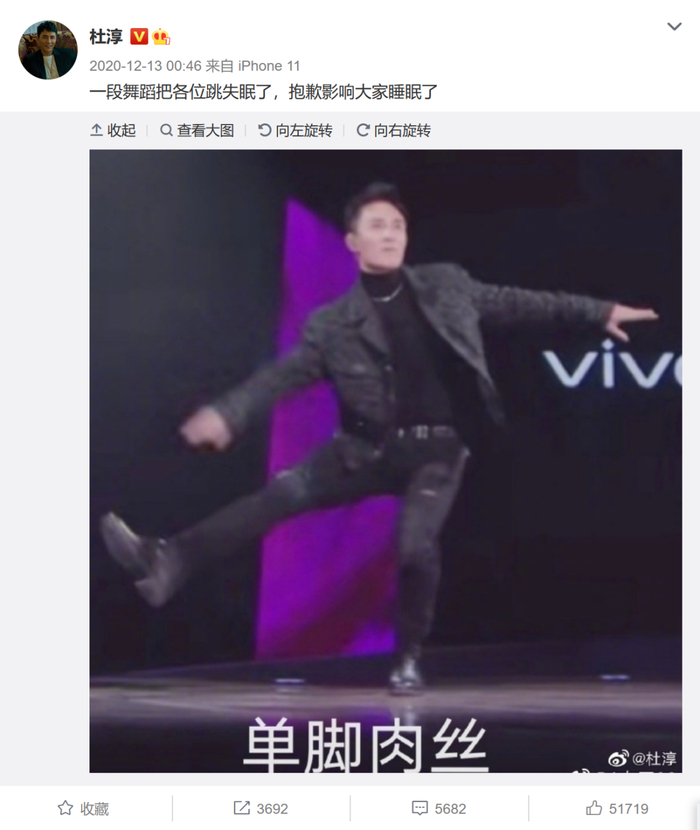 表演完《情人》,杜淳在微博自我调侃“蛋饺肉丝”的梗。