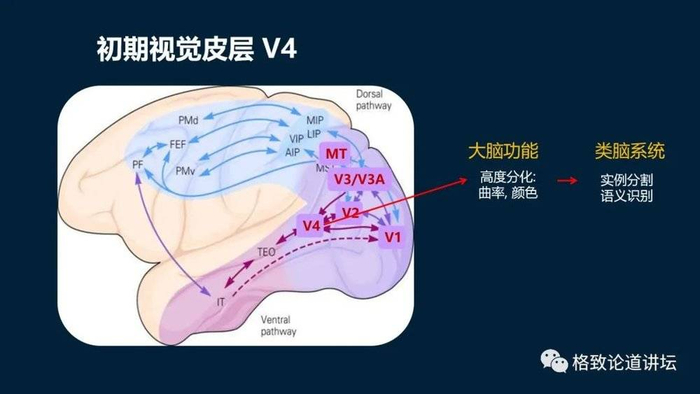 还有进入到更深一层的,就像V4里面就有高度分化,有曲率还有颜色等,这些我们在图像处理里面,就可以分成实例分割或语义识别。