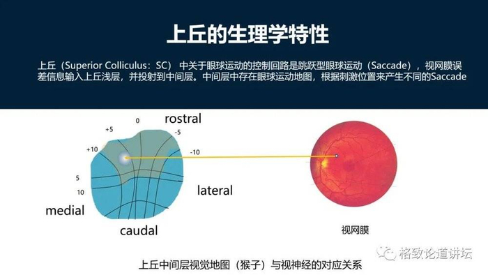 其实这两个不是完全匹配的,右边是人的视网膜,左边是猴子的上丘,猴子上丘的中层,有一个地图和视网膜是一一对应的。