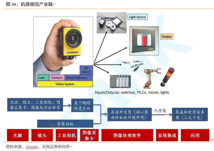 机器视觉:5G工业的“眼睛”。机器视觉(Machine Vision)指的是通过光学的装置和非接触的传感器自动的接收和处理真实物体的图像,以获得所需信息或控制机器人运动的装置,就是应用在工业领域的视觉应用。机器视觉的基础功能主要可以分为四大类:模式识别/计数、视觉定位、尺寸测量和外观检测。从产业链来看,机器视觉包括光源、镜头、工业相机、图像采集卡、图像处理软件、系统集成以及应用等,具体看镜头,工业镜头主要可以分为定焦镜头、定倍镜头、远心镜头、连续变倍镜头等,不同的镜头根据要求应用于不同的工业现场。