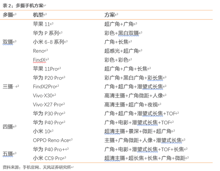 1) 像素持续升级:手机主流像素从先前的12 MP升级到目前的32/48/64MP,19年底小米还推出了1亿像素手机。此外,由于手机配置多摄,除了主摄外,广角、超广角等辅助平行镜头像素也会持续提升。
