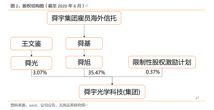 股权结构:公司员工信托为实际大股东,实行精英共治。公司第一大股东为舜旭,截至2020年6月持有公司35.47%股份,舜宇集团雇员海外信托通过舜基持有舜旭100%股份,为公司实际控制人,此海外信托受益人包括王文鉴、叶辽宁、孙涣、王文杰先生等公司创始人/高管以及达盟信托等,且王文鉴、叶辽宁、孙涣、王文杰先生通过限制性股份奖励计划持有公司0.37%股份,此外,王文鉴先生通过舜光还持有公司3.07%股份。公司杜绝企业家族化,实行精英共治,在企业持续经营过程中,创始人不断通过股权改制给通过绩效鉴定的员工/外部股份/代理商等拿到限制性股票。