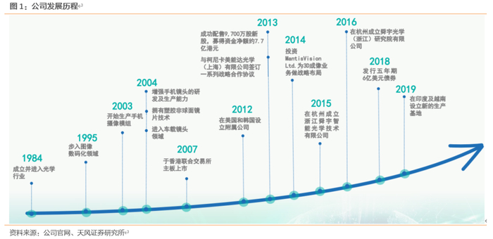 l2004-2007成长期(成功上市):03年确立名配角战略,并且2004年开始量产手机摄像头模组,进入手机业务领域;05年引入世界顶级投资公司INVESTOR AB和美国成为基金等国际资本,07年完成港交所上市。