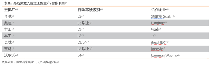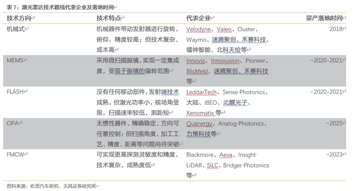 技术瓶颈突破+产业链配合落地,激光雷达加速渗透。激光雷达按照技术架构可以分为整体旋转的机械式激光雷达、收发模块静止的半固态激光雷达以及固态式激光雷达。目前主流的固态激光雷达有MEMS(Micro-Electro-Mechanical System,微机电系统)、OPA(Optical Phased Array, 光学相控阵)技术和Flash (泛光面阵)技术三种。其中机械式、MEMS、FLASH在2018年以及20-21年之间量产落地。除突破技术瓶颈外,LiDAR供应商与主机厂商积极合作,争取实现搭载、落地具体车型,目前,我们可以看到奥迪与法雷奥/ Luminar、宝马与Innoviz、沃尔沃与Luminar,长城汽车与Ibeo,现代与Velodyne等均已开启合作。20年初,博世首款车规级长距离激光雷达已进入量产开发阶段,大陆集团的Flash激光雷达也即将在量产新车上搭载。