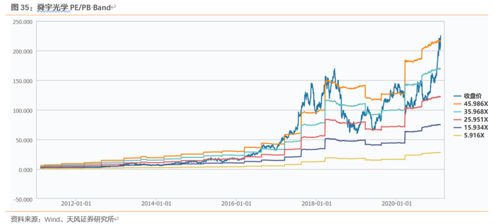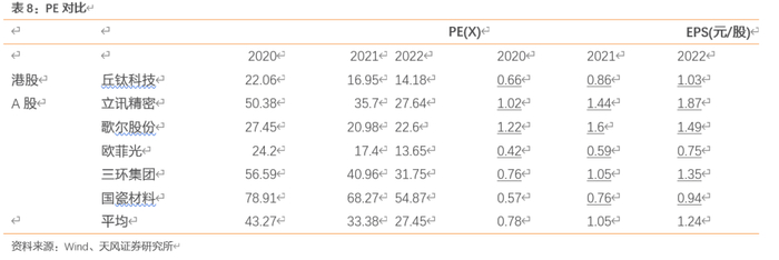 从估值上来看,公司镜头和模组双轮启动,我们选取a股消费电子公司(欧菲光:与公司业务相近,客户有重叠,立讯及歌尔:同为国内模组组装龙头,客户有重叠)、材料公司(镜头制造技术门槛材料)、港股镜头组装公司以及作为可比公司,得出21年平均PE为33x,由于公司为全球消费电子以及车载镜头龙头,给与公司21年在港股40xPE。纵向来看,公司历史估值长期落在25-35x,然而鉴于公司21年客户有突破以及5G时代换机及汽车智能化进程加速,支持给与21年公司港股40xPE的结论。