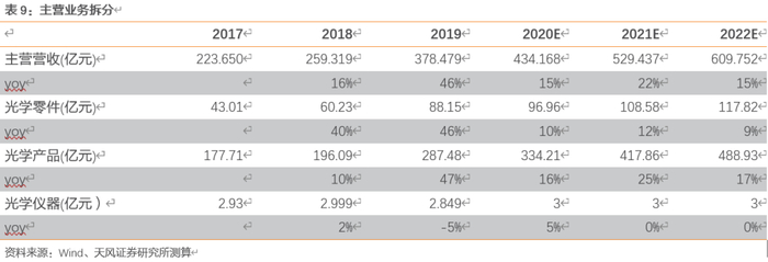 l光学零件:具体分为玻璃球面镜片、手机镜头、车载镜头以及其他镜头,17-19年数量持续增长,板块整体数量从7.12亿件增长到14.84亿件,ASP则在6元左右波动。具体来看主要的增长动力为手机镜头,17-19年出货量平均增长率为53%。