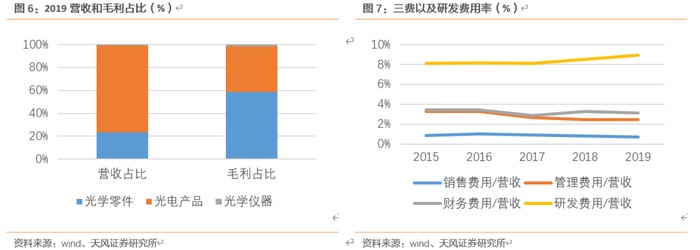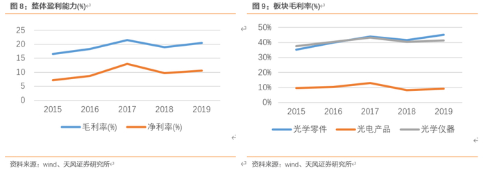 利润端:光学零件为主要贡献利润板块,盈利能力稳定。公司三大营收板块光学零件、光学产品以及光学仪器2019年营收占比为2:7:0.1,毛利占比分别为5:3:0.2。从盈利能力来看,15-19年公司整体毛利率在16-21%波动,净利率在7-13%波动。分板块来看,光学零件以及光学仪器的毛利率较高,光学零件的毛利率从15年的35.1%增长至19年的45.2%,光学仪器从15年的37.5%增长率19年41.3%, 光学产品毛利率比较低,毛利率在10%上下波动(18年8.4%,17年13.1%)。从费用率来看,公司期间费用率(销售+管理+财务)在3%左右波动,研发费用率在5%左右波动。
