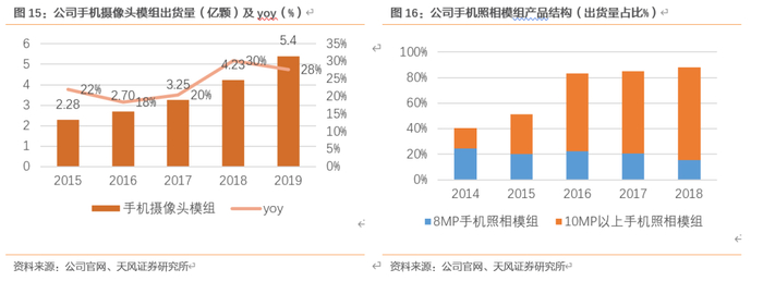 手机摄像头模组年增长稳中有升,结构优化+产品拓展。15-19年公司手机摄像头年增速在20%波动,19年公司手机摄像头模组出货5.4亿颗,yoy+28%。产品结构持续优化,8MP手机照相模组出货量占比:10MP以上从14年的11:7优化至18年的2:9,19年公司潜望模组和大像面模组的整体出货量从46万增长至3146万,yoy+6724.1%,占比提升至6%。此外,公司持续产品拓展,目前已经实现TOF、结构光、潜望式高倍率、超大光圈、超大像面等摄像头模组的量产。