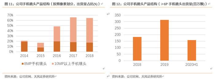 镜头产品结构持续高端化:19年之前公司按照像素披露手机镜头产品结构,除了15年外,8MP手机镜头出货量占比公司出货量基本在17%附近波动,10MP手机镜头自14年以来成长迅速,18年出货量占比公司出货量的47.1%。19年之后,公司按照镜片数量进行产品结构的披露,6P及以上的手机镜头19年出货量为3.14亿颗,yoy+72.2%。